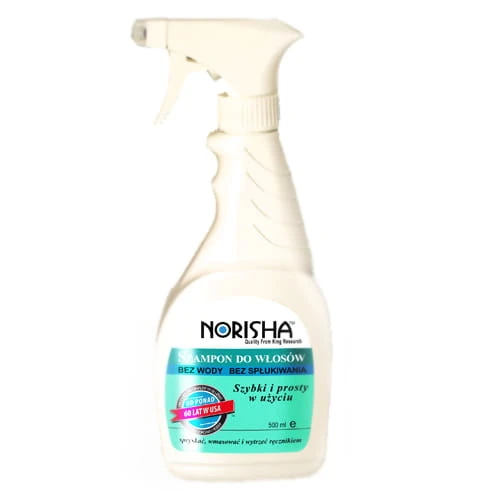 Większość szamponów „bez wody” jest produktem suchym (w proszku).Pozostawiają resztki proszku we włosach, i nie dają uczucia czystych "umytych" włosów.Norisha jest cieczą, zapewnia uczucie świeżych, umytych włosów.Wystarczy rozpylić go na suche włosy, wmasować i wytrzeć suchym ręcznikiem!