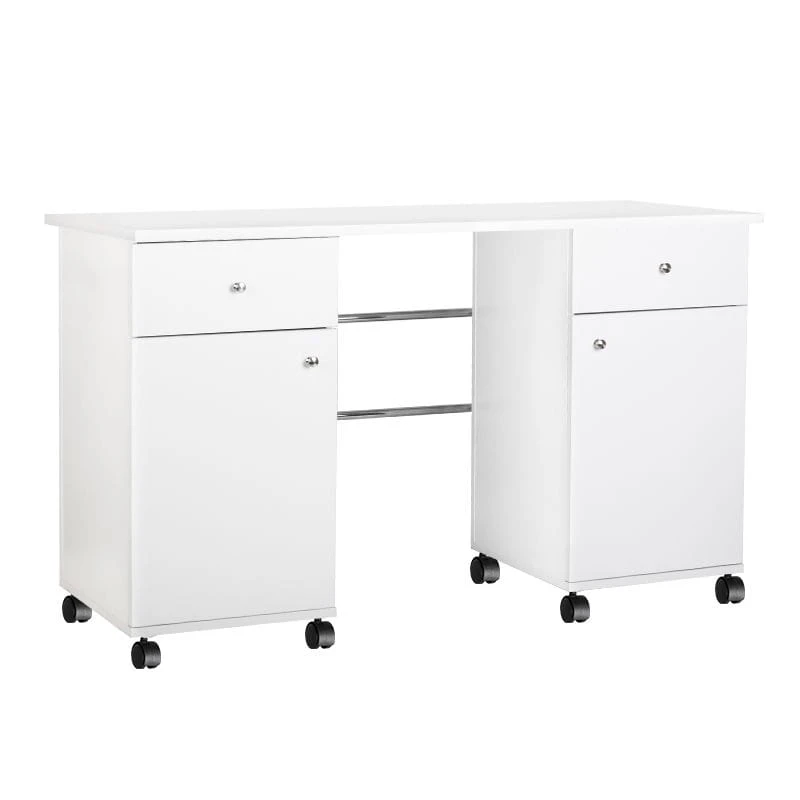 Posiada dwie szafki z pojemnymi szufladami i półkami.. Dzięki aż ośmiu kółkom mebel jest stabilny oraz łatwo go przestawiać w pomieszczeniach, nawet jeśli jest obciążony. Blat z płyty meblowej. Stolik jest idealny do wykonywania zabiegów manicure