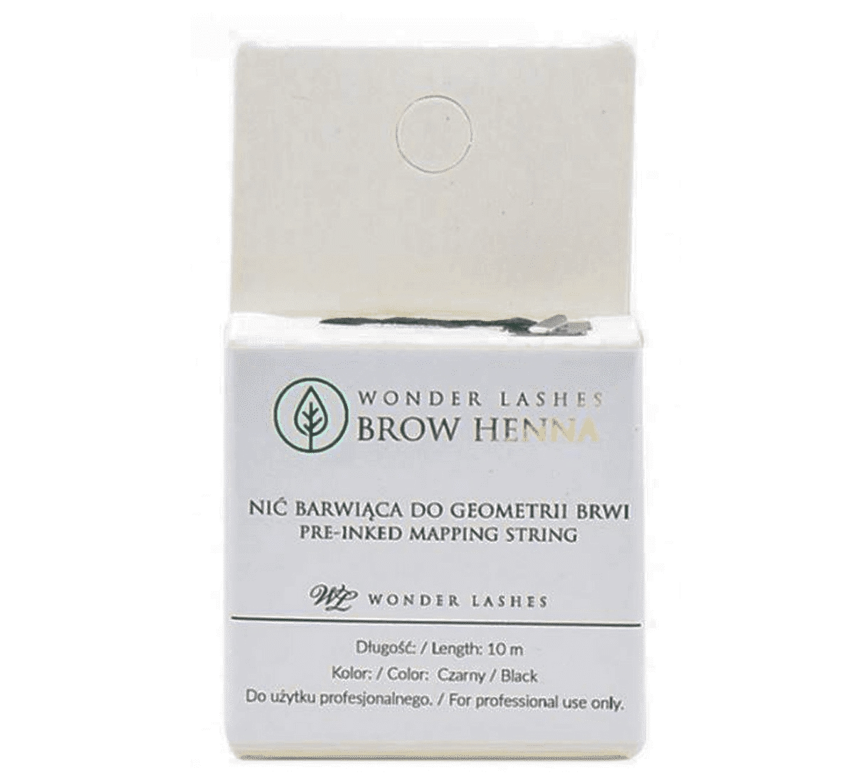 Profesjonalna nić do wyznaczania geometrii brwi. Nasączona naturalnym, czarnym barwnikiem, rozpuszczalnym w wodzie.