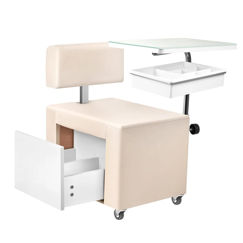Fukcjonalny pomocnik przydatny przy zabiegach pedicure, pełni fukcję szafki z szufladami oraz siedziska z podręczną ruchomą tacką