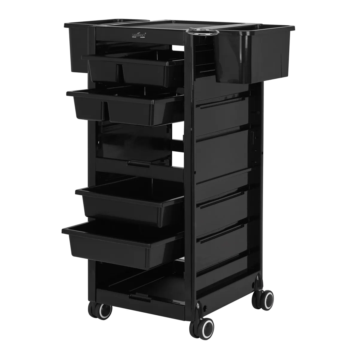 Pojemny organizer wyposażony jest w zestaw kuwet, które pomogą zadbać o porządek w miejscu pracy, posegregować odpowiednio niezbędne w pracy fryzjera przybory. W zestawie znajduje się sześć pojemników: dwa bez przegródek, dwa z przegródkami oraz dwa wąskie i głębsze. Ich układ w organizerze można dowolnie zmieniać, dopasowując go do własnych potrzeb, a znaczny wybór różnych typów szuflad pozwala na posegregowanie przyborów według uznania. Dodatkowo dwie najgłębsze kuwety można umieszczać na różnych wysokościach po bokach pomocnika, dzięki czemu ułożone w nich przybory zawsze znajdą się na odpowiednim poziomie. W tym modelu szuflady wysuwają się w obie strony, co jest znaczącym usprawnieniem i ułatwia dostęp do produktów oraz narzędzi w dowolnym momencie.