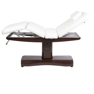 Ekskluzywny, wspaniale wykonany stół do masażu i zabiegów pielęgnacyjnych. Elegancki, klasyczny o wspaniałych wykończeniach i pięknej formie. Idealnie nadaje się zarówno do gabinetów odnowy biologicznej, gabinetów kosmetycznych, salonów masażu i spa sterowany elektrycznie za pomocą 3 siłowników: - elektrycznie regulowana wysokość położenia stołu (zakres 25cm) - elektrycznie regulowany kąt ustawienia podparcia pleców - elektrycznie regulowany kąt ustawienia podparcia podudzi, dzięki czemu ciało pacjenta układa się w bardzo komfortowy, ergonomiczny sposób Sterowanie wbudowane w konstrukcję stołu, pilot ręczny za dopłatą Istnieje również możliwość instalacji sterowania za pomocą pedału nożnego, za dopłatą Pod zdejmowalnym zagłówkiem otwór na twarz (do masażu pleców) Konstrukcja metalowa obudowana materiałem wspaniale imitującym drewno w kolorze mahoniu, wszystko bardzo estetycznie wykonane i wspaniale dobrane stylistycznie.