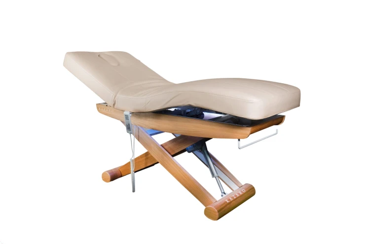 Luna X Plus łączy trzy rzeczy, które rzadko pojawiają się razem w tej klasie cenowej: podgrzewaną powierzchnię na całej długości leżanki, udźwig 150 kg i dekoracyjną podstawę w kształcie X z naturalnego drewna.