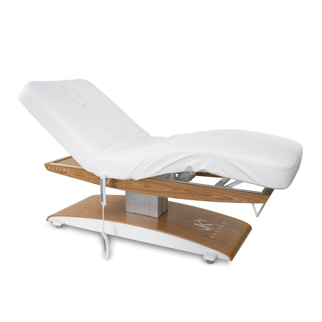 Kazaro Luna T Plus to elektryczna leżanka kosmetyczna wyposażona w 4 siłowniki (w tym 2 do regulacji wysokości), funkcję podgrzewania i pojedynczą kolumnę podstawy, sterowana ręcznym pilotem. Zakres regulacji wysokości 59–92 cm to jeden z najniższych punktów startowych w tej klasie sprzętu – klientka siada i wstaje bezpiecznie nawet przy niskim wzroście, a kosmetyczka pracuje w optymalnej pozycji ergonomicznej. Pojedyncza kolumna podstawy zapewnia swobodny dostęp do pacjenta z każdej strony leżanki.