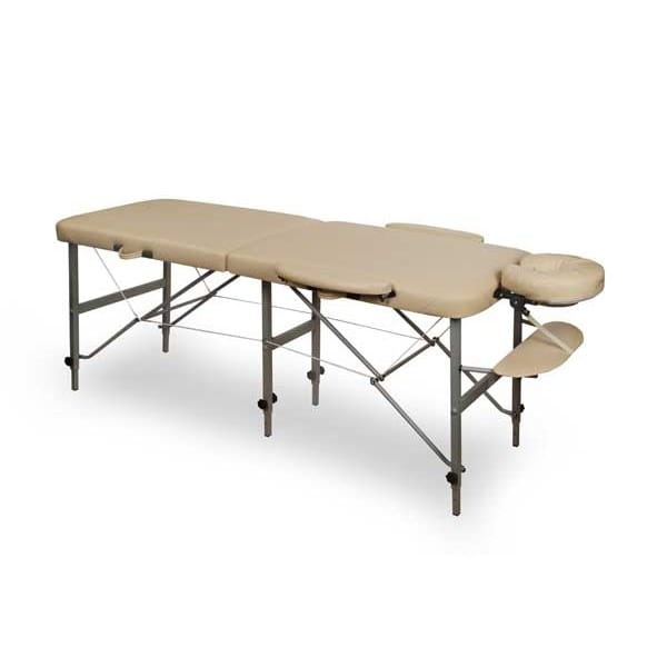 Cechą charakterystyczną stołu ROYAL ALUMINIUM jest jego owalny kształt i wyjątkowa stabilność - dopuszczalne obciążenie to 300kg. Stół wykonany jest z aluminium, jego podstawę stanowią trzy nogi połączone stalowymi linkami, które nadają stabilność, lekkość i ułatwiają składanie i rozkładanie stołu Pod blatem, obitym wysokiej jakości tapicerką, znajdują się poszczególne części wyposażenia dodatkowego /podgłówek, podłokietniki, półka pod ramiona/, podtrzymywane przez elastyczne pasy, dzięki czemu po złożeniu stół wraz z niezbędnymi akcesoriami można wygodnie przenosić.